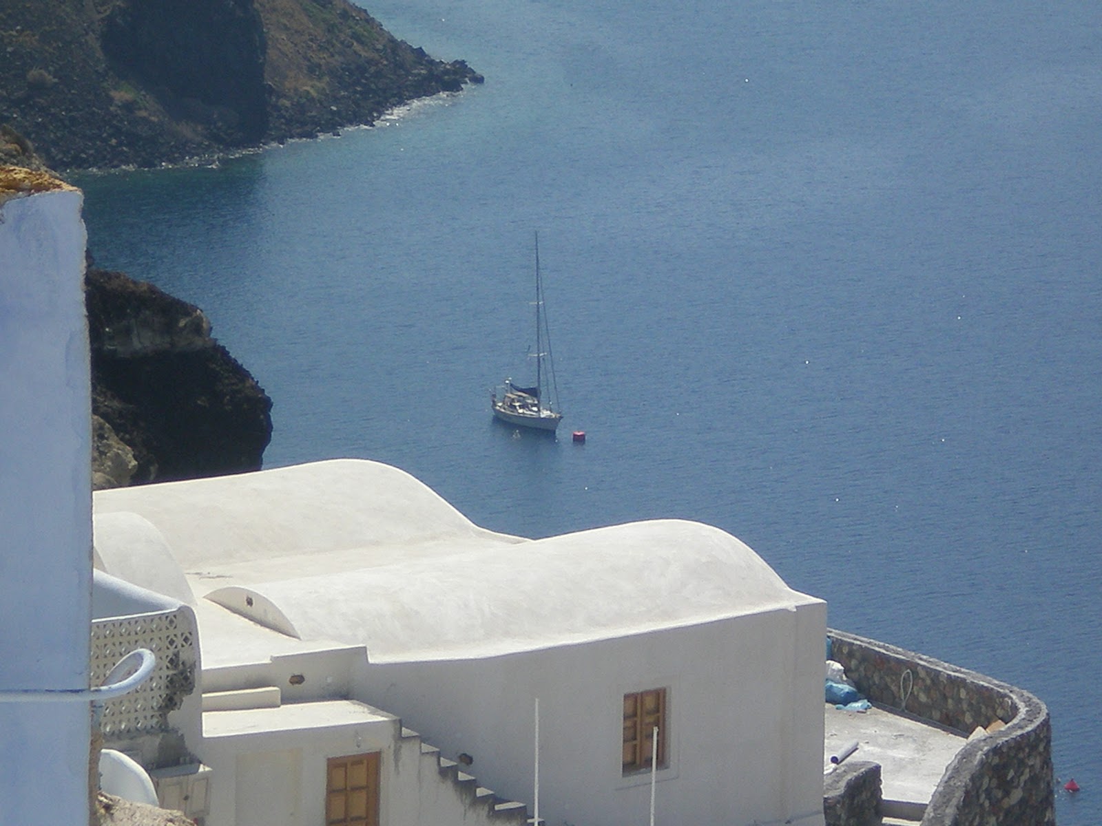 We were moving south through the island chain, and another weather window presented itself as chance no 2 to go somewhere on the "must see list". The amazing island of Thira, much better known as Santorini, is the absolute jewel in the crown of all the Greek Islands. We could not miss this opportunity and set sail south from Paros, arriving late afternoon inside the crater walls of this stunning submerged volcano. It is difficult for me to describe the beauty of Santorini, it is a living canvas. From the boat by day we stared at the stark volcanic walls, soil lines recording its explosive history. By night we watched the full moon rise, the stark white sugar cube houses glowing in its reflection a truly magical vista. The villages lie perched high above the sheer cliffs, tiny white houses cling to the cliff sides, sometimes it seems that the creeping plants are all that is attaching them. The beautiful "med blue" church domes mirror the water shades, everywhere you look the scene is perfect, it is full of moments and images that will be remembered always.